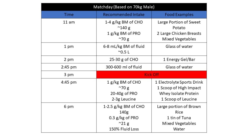 As you can see from the table, nutritional prescriptions are based on body mass. The means in order to monitor nutritional intake closely you as coaches will have to monitor the weight for your players to ensure you are accurate when planning meals for them not just on a matchday but throughout the week.